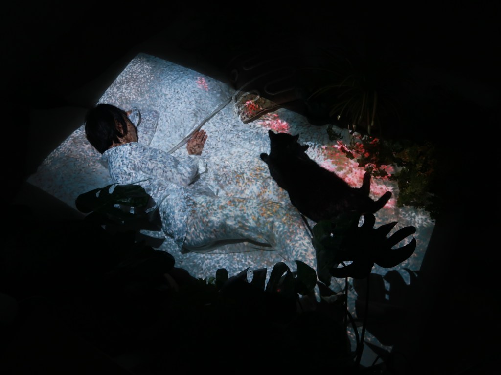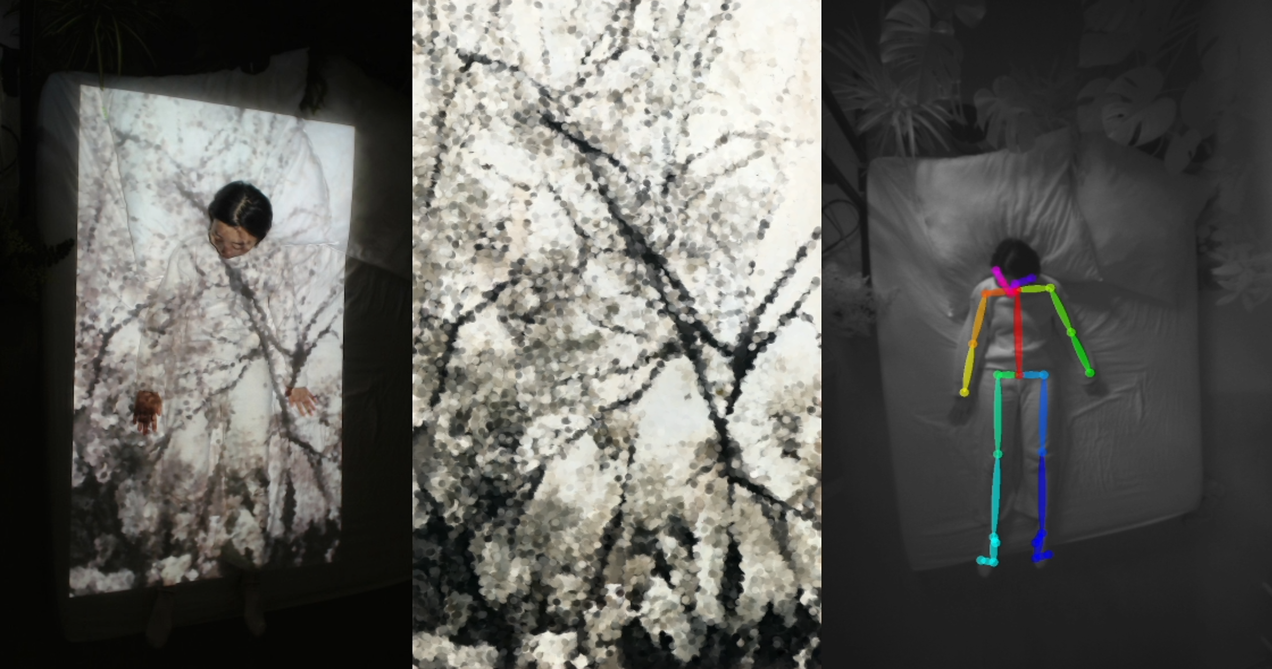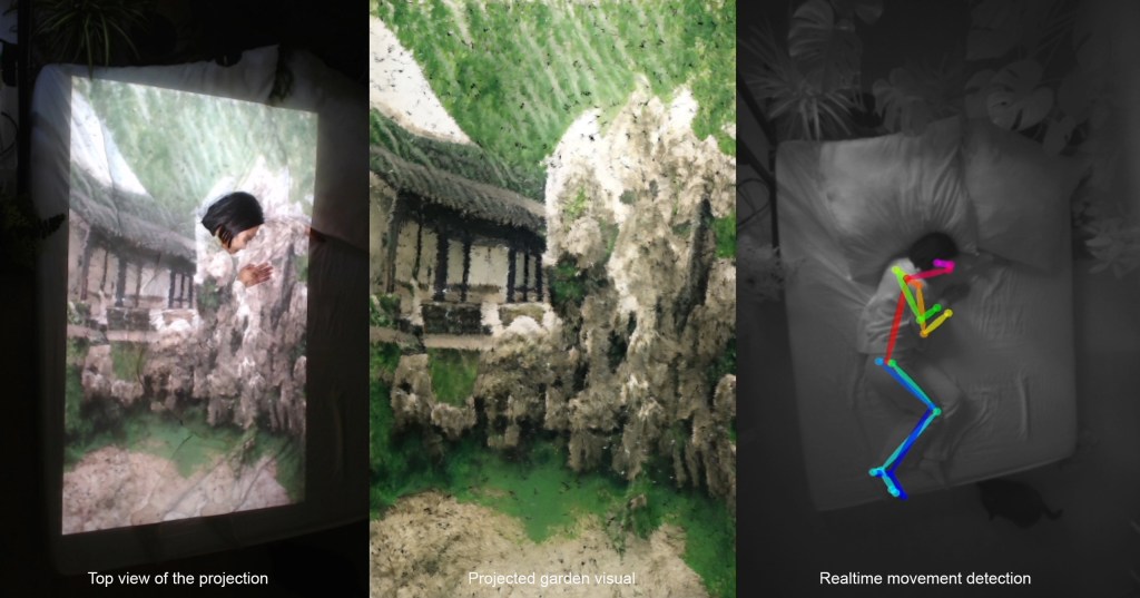 Private Garden is an interactive installation. Visitors can lie in the bed and move their body to interact with the projected garden visuals. Imagine when you are busy walking around the garden and exploring, insects and birds might be scared away and you might also not pay enough attention to the surrounding environment. So when the visitor moves a lot in bed, the garden visual will turn more fragmented and change rapidly into other scenes and the ambient sound will be turned down.