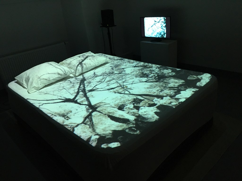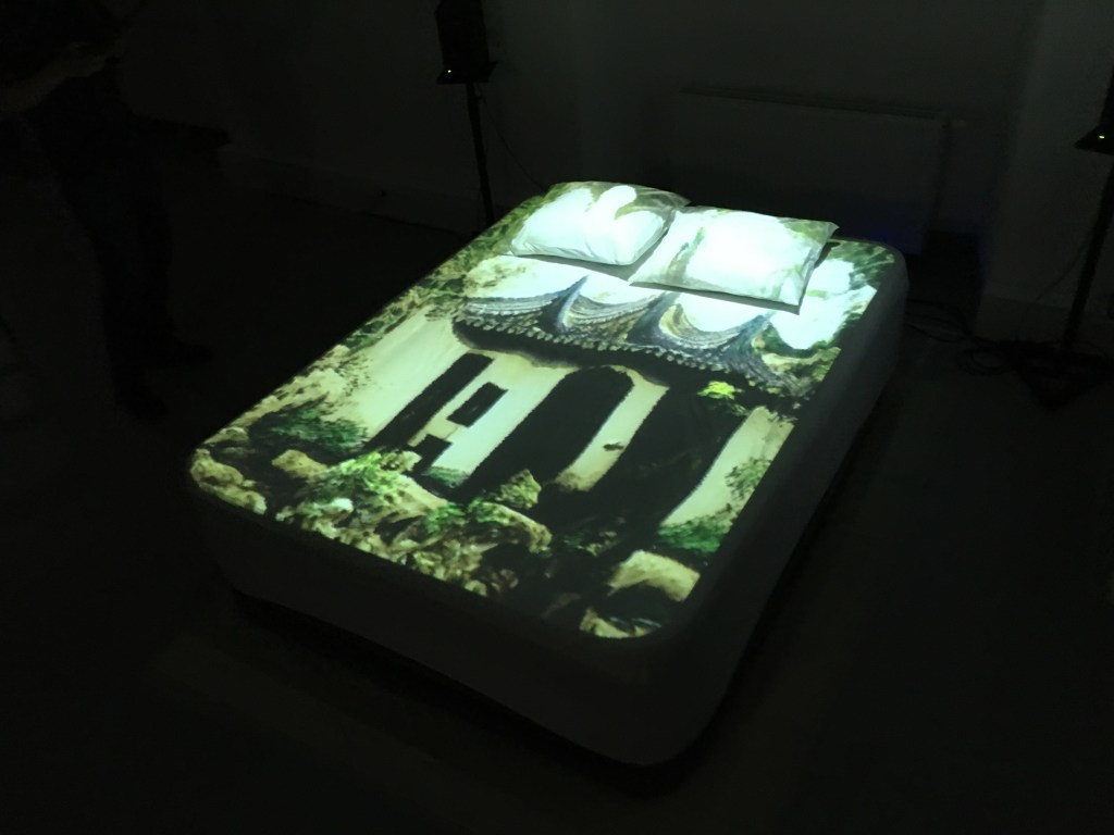 Private Garden is an interactive installation which projects computer generated and processed garden visuals onto the surface of a bed. Visitors can lie in the bed and interact with the projected garden visuals and ambient sound with their body movement.