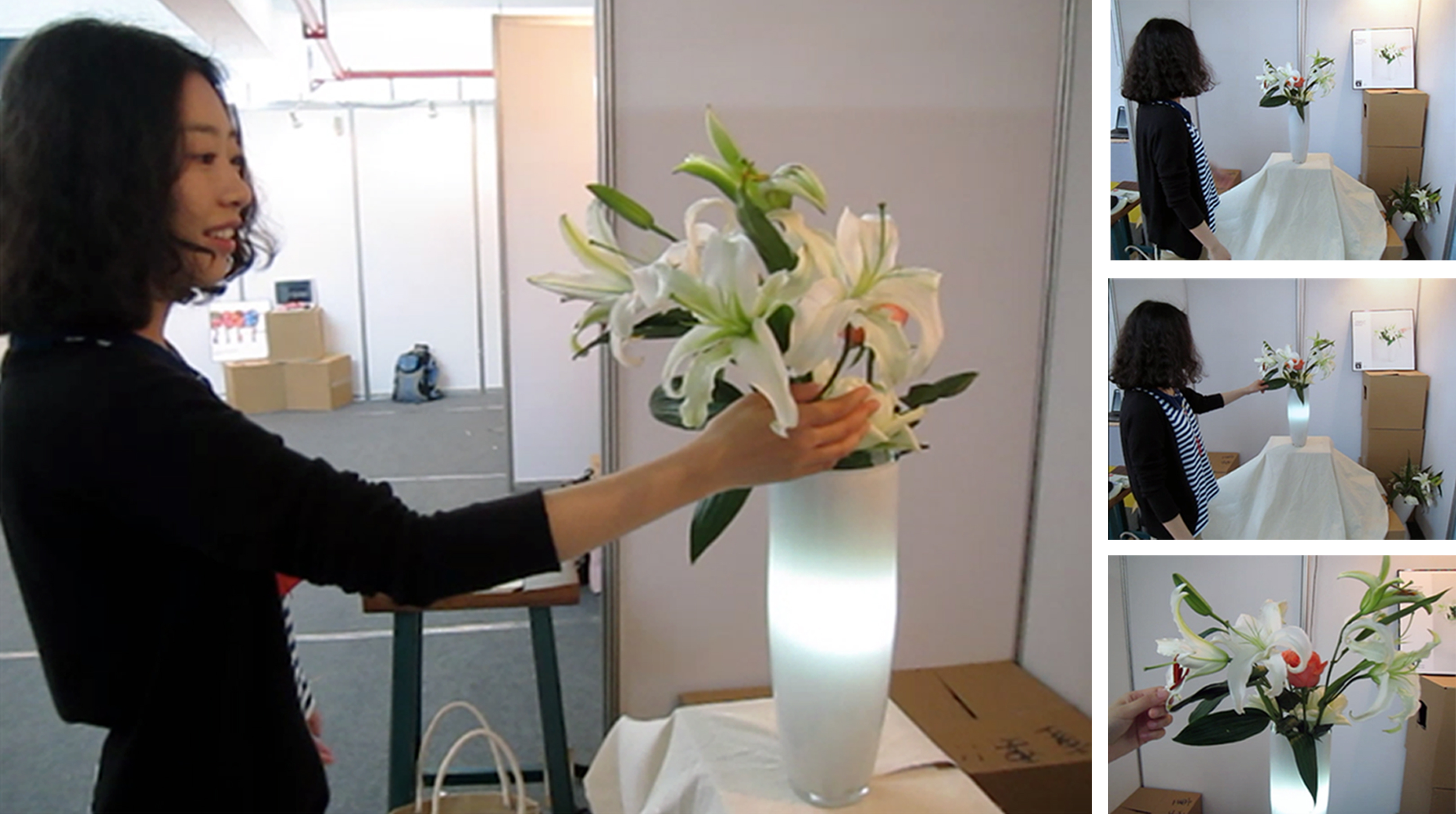 No external electricity is applied for stimulation, thus guaranteeing safety for both the plant and the human being at interaction. The demonstration device is composed of a bundle of flowers and a frosted vase with built-in electric circuits, light and speaker. The end of the flower bundle is immersed in the water inside the vase.